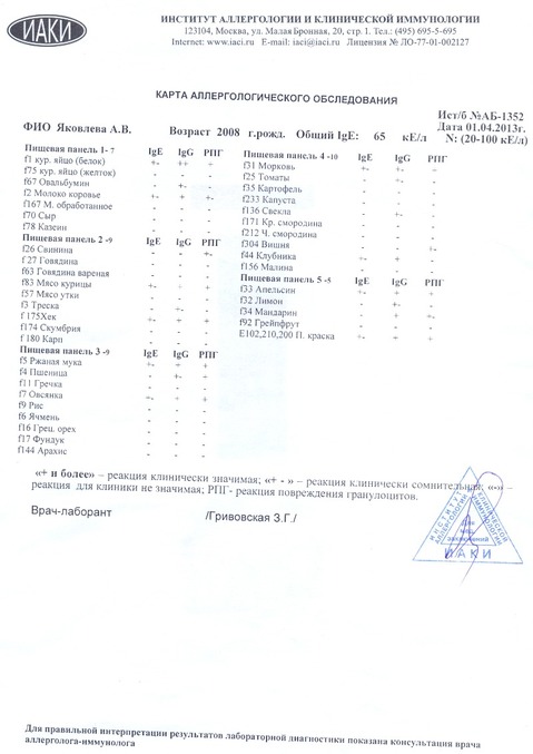 Решила снова обратиться к гастроэнтерологу, которая вылечила нас три года назад. Направили нас на в институт аллергологии сдать анализ на пищевые аллергены.