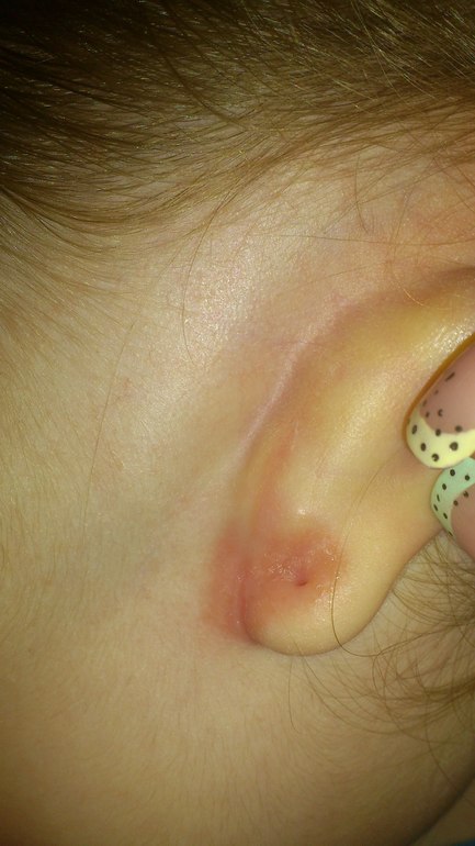 У нас такое было, когда мы дочке простые сережки одевали. Дырочка от сережки припухала и с неё текло. Как только снимали сережки все проходило. На фото видно что ушки проколоты. Может от сережек....
