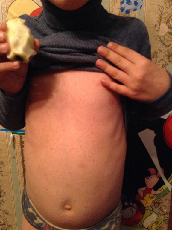 И вот вечером смотрю - что-то щечки румяные, а температуры нет. Попросила показать животик, а он весь усыпан, немного спина и ноги. Не беспокоит. Да и вообще ничего не беспокоит. Аллергия вряд ли, вчера давала зиртек. Завтра врача пригласим, конечно. Но посмотрите на фото - может кто опознает, что за зверь?