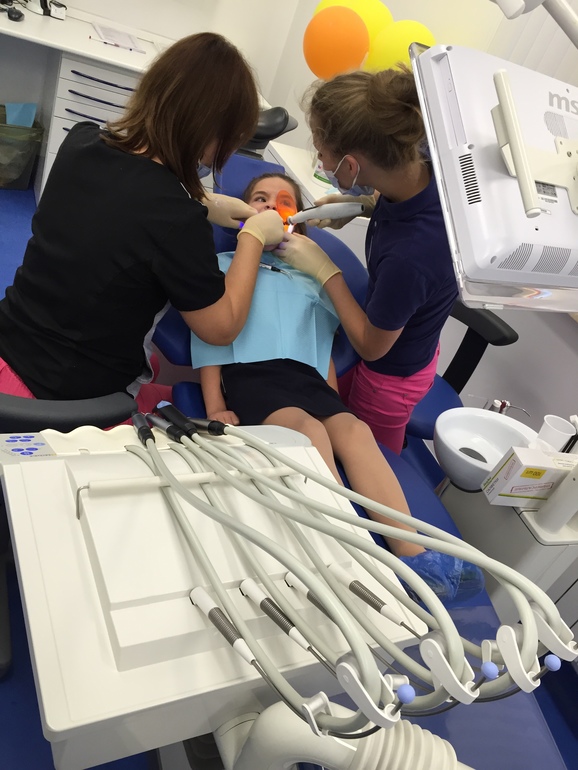 Я ее готовила к этой процедуре заранее... показала ей видео, как это делается. Объяснила, что никакой боли быть не должно. И правда, так оно и было... Все заняла буквально 15 минут: сняли налет со всех зубов, промыли, собрали слюну, вскрыли фиссур бормашиной (нестрашно), загерметизировали, посветили ультрафиолетом. Всего сделали 2 зуба нижних... верхние - сказали не трогать...