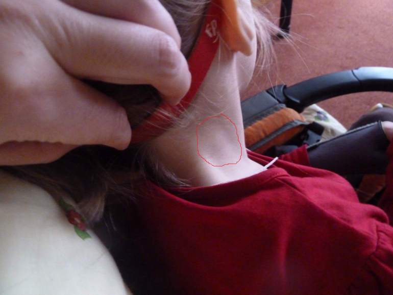 Суть: сегодня причесывала дочку сидя, она повернула голову влево и справа на шее я обнаружила бугорок. Конечно, сразу прощупала, слева такого нет. Я голову и так и эдак, есть горошинка вроде. Довольно низко расположена, некрупная внутри. Лежа не прощупывается. Точнее есть, но если не знать о ней, то лежа ничего не заподозришь.