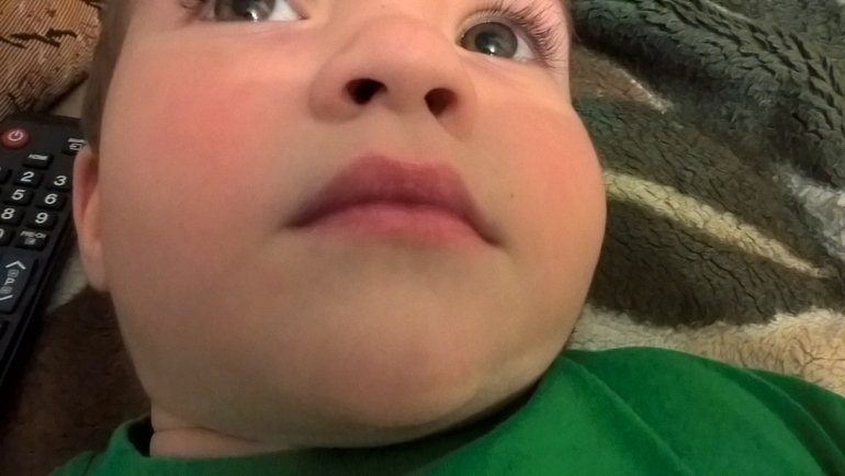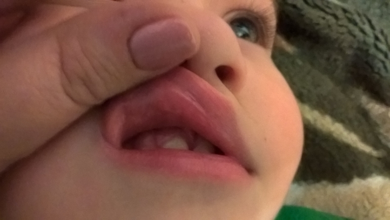 на первом фото он поджал нижнюю губу и верхнюю я уже натрогала - поэтому покраснело. на последнем фото видите как будто что то белое? вот как раз в этом месте был разрыв