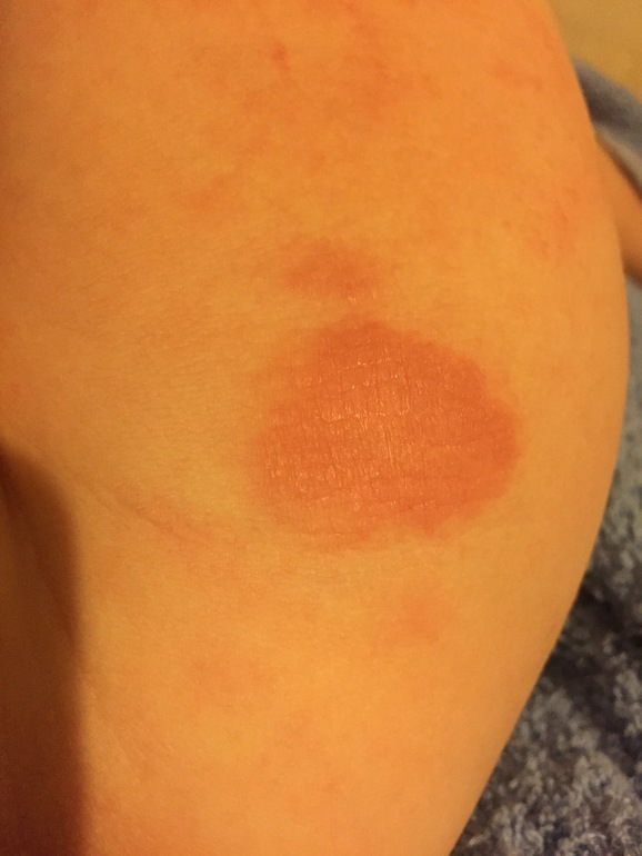 У моего на ляжке с года была шершавость. Иногда больше, иногда меньше, но никогда не проходила до конца. Я ничего не давала. Как исполнилось 6, всё само прошло, как будто и не было ничего.