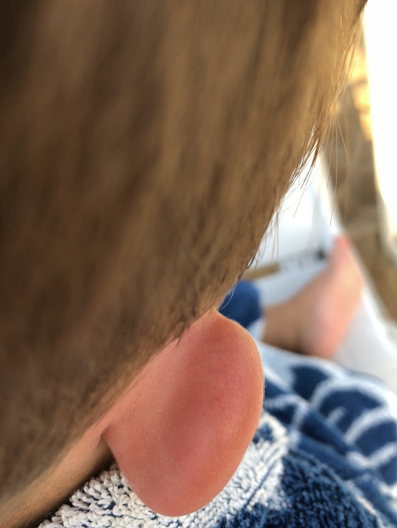 Утром ушко было красное, сейчас опухло, и горячее. Утром они с братом подрались