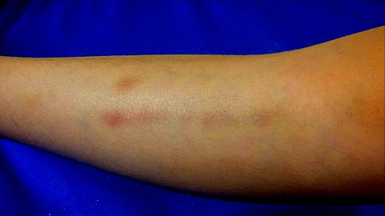У меня есть версия, но не знаю даже... на полу в одной части комнаты ортопедические коврики, там разные они, типа травка или помпочки такие маленькие и тд. Могла на них присесть, пока играла на полу, и так сдавить на ноге капилляры. Хотя могла и об кровать треснуться, об ножку кровати, она на них кувыркается, я только и успеваю страховать.