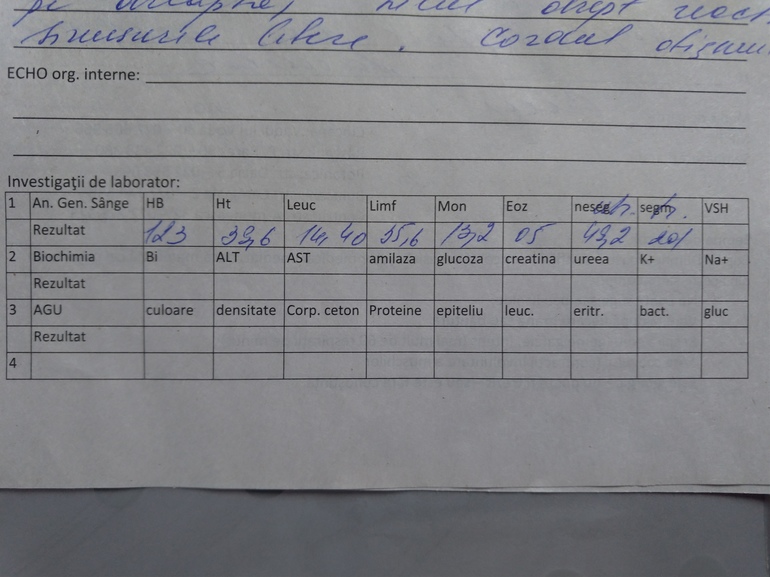 На следующий день мы должны были ехать домой в Молдову, как то же самое с младшим ребенком. Уже решили с ним обратиться в нашу больницу. Это было Рождество. Я бы утром 8-го числа сдала бы кровь в частной лаборатории, да выходной у всех. С 2 ночи до 6 утра мы катались по больницам столицы Молдавии, потому что все переводят стрелки "это не к нам", то возраст не тот, то температура не та (была 40 на трассе, сбили ибуфеном до 37 и с этим и приехали в больницу, которые не хотят нас смотреть, потому что температура СЕЙЧАС не высокая). Мы просили то же самое, как в Румынии - сделать биохимию крови и рентген если надо. Педиатр на вид определила, что это просто вирус, я сказала, что не уеду без анализа. А то было уже в марте, что все слушали и никто не слышал запущенную пневмонию у старшего. Сделали, сказали, анализ хороший, рентген хороший, это вирус. Питье и противовирусные давать. Но вот вчерашний день и сегодняшний день температура сбивается, но все равно растет 38.9 - 39.8. В анализе крови, который "хороший" по словам педиатра вроде не очень хорошие показатели, или я путаю?