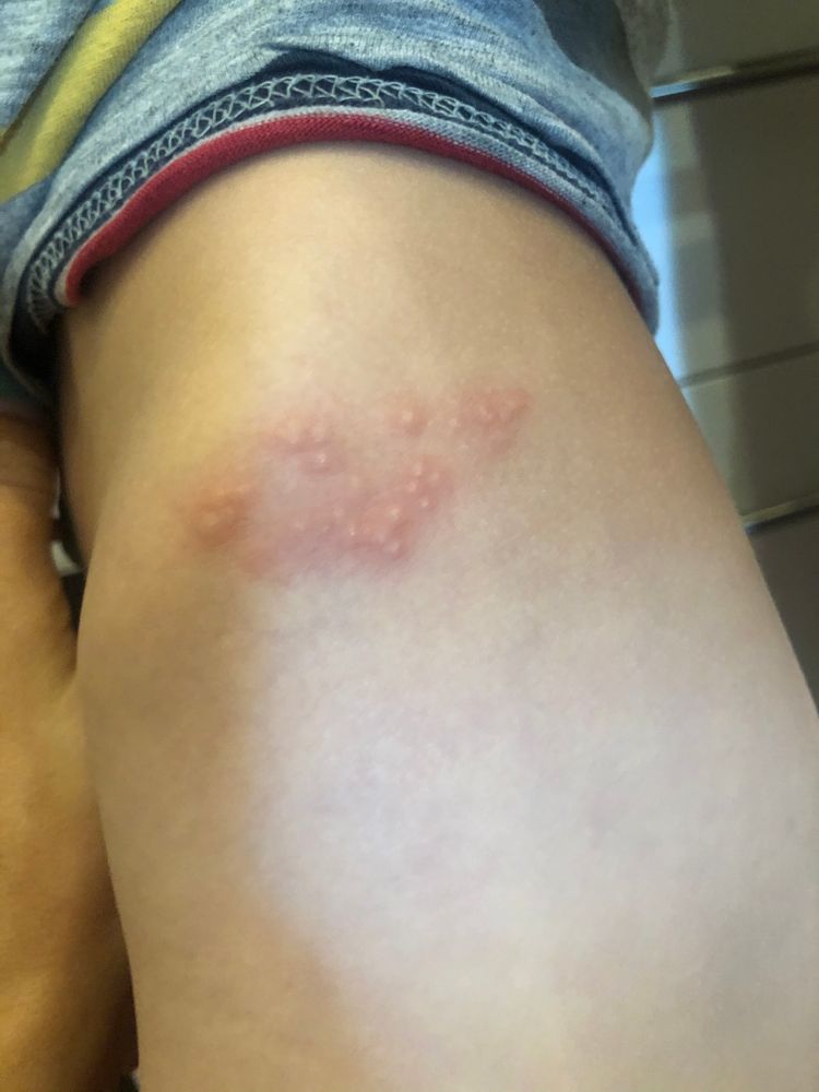 Аллергия и прочие высыпанияДобрый день! Были в отпуске на нашем юге, дети целыми днями бегали на улице. Перед отъездом обнаружила на внешней стороне бедра вот такие высыпания. Сначала думала покусали, потом - герпес ((( но на герпес не похоже - тк не чесалось и высыпания не были водянистыми внутри....