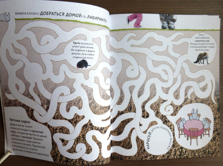 Последовательности и логики в порядке преподнесения материала в книге нет. Темы на разворотах дудлпедии не связаны между собой, каждый разворот - отдельная тема. В книге рассказывается немного о динозаврах, в виде лабиринта ребенку показаны подземные ходы к норкам животных, где одновременно нужно пройти лабиринт, помогая кролику добраться домой и заодно ребенок узнает какие животные еще имеют свои норки. Из книжки можно познакомится с временами года, узнать, что такое экватор, что такое скелет, как он выглядит у человека и даже попробовать нарисовать скелеты некоторых обитателей фауны, дорисовать и раскрасить цветочный сад, создать симметричный рисунок на крыльях у бабочек. Особенно забавные задания где надо дорисовать прически и эмоции на лицах людей