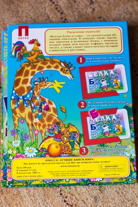 В комплект входят картонные карточки и резиновые буквы, с помощью которых дети составляют слова. Очень классная книга! У меня сын давно знает алфавит, поэтому сследующая ступенька просто "требовала" данное издание, потихонечку начинаем понимать, что буквы можно соединять в слова.