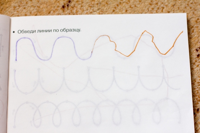 Ребёнок уже в состоянии самостоятельно повторять рисунок по прозрачной страничке, пусть и косо-криво!