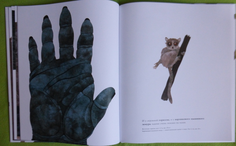 Книга «Сравни!» впечатляет с первого взгляда, начиная с обложки, где мы видим огромную лапу гигантской гориллы в сравнение с карликовым мышиным лемуром.