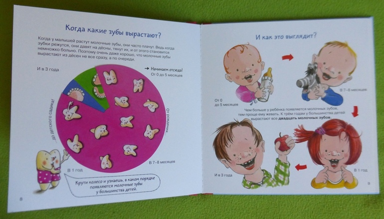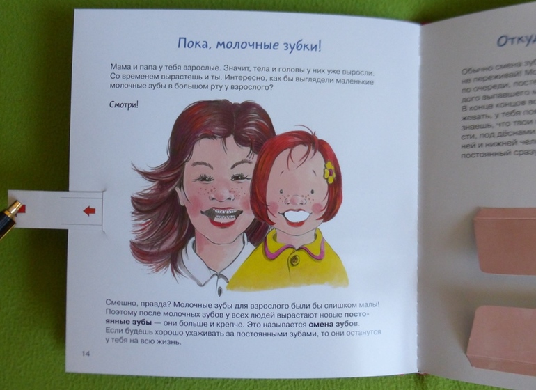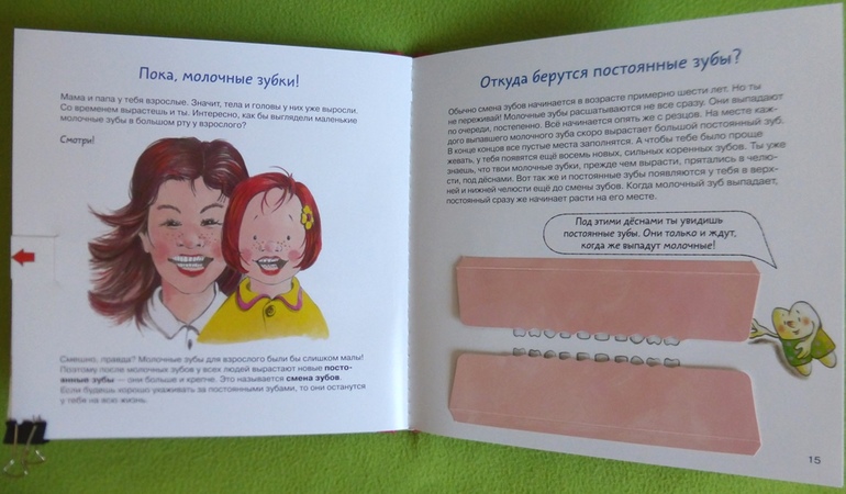 Забавный разворот с интерактивным элементом, предлагается сравнить зубы мамы и дочки, наглядно представлено насколько у взрослого зубы больше, как зубы малыша смотрятся у взрослого во рту.