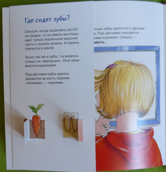 - Где сидят зубы? - очень интересный разворот, рассказывается где сидят зубки и как, сравнение с морковкой и все это с окошками, на этом же развороте прикреплено зеркало, где предлагается малышу заглянуть себе в ротик и посмотреть строение зуба, конечно дети с удовольствием это делают