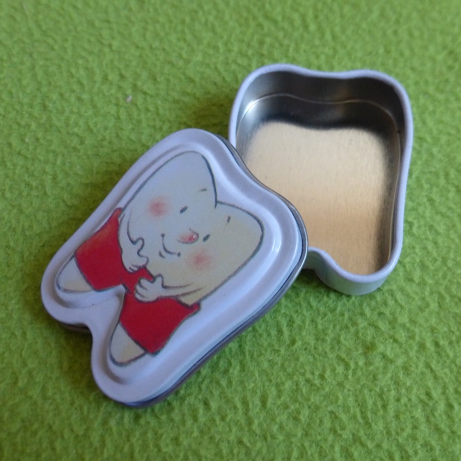 Какая приятная неожиданность - это небольшая железная коробочка для хранения первых молочных зубов. Качественно сделана, края все закруглены, на крышке нарисован веселый зубик.