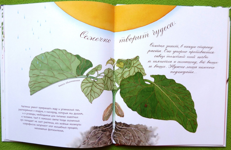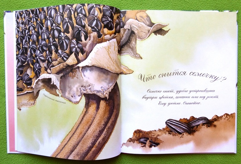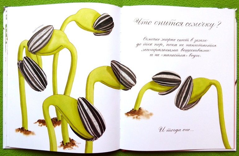 Дети дошкольного возраста очень любят разглядывать серии последовательно меняющихся картинок, в книге подробнейшим образом показано, как растет и меняется семечко, что и когда из него вырастает. На отдельных разворотах показано семечко в процессе роста «в разрезе».