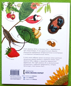 В начале книги мы видим «коллекцию» семян, в финале, на последнем развороте, уже появляются не семена, а выросшие из них растения с цветками и плодами, в которых кроются семена из первого разворота. Сравнение первого и последнего разворотов книги - отличный способ задуматься вместе с ребенком о том, как развивается жизнь.