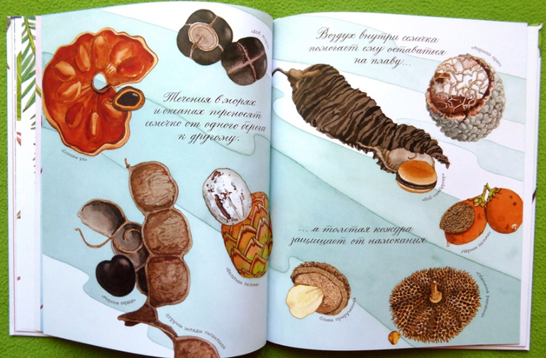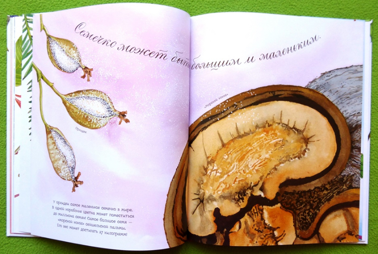 В издание встречается много названий экзотических растений, почти половину из них я сама не знала. В тоже время, порадовало, что базой для рассказа о развитие семечка были взяты более привычные для нашего климата растения - фасоль, тыква, подсолнечник, сосна.