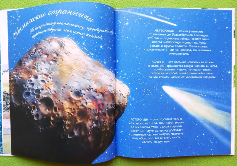 «Метеороиды - камни размером от песчинки до баскетбольной площадки. Это они - падающие звёзды ночного неба. Иногда метеороиды падают на Луну, Землю и другие планеты. Такие камни, прилетевшие к нам из космоса, мы называем метеоритами.»