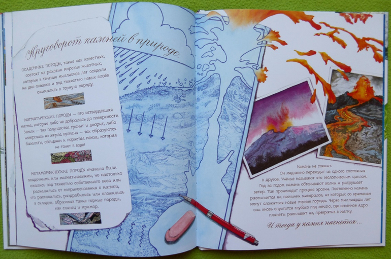 Круговорот камней в природе. На этих трех разворотах кратко и лаконично рассказано о цикле жизни камня.