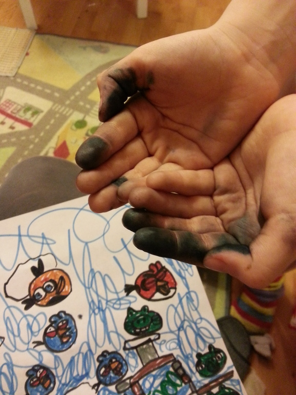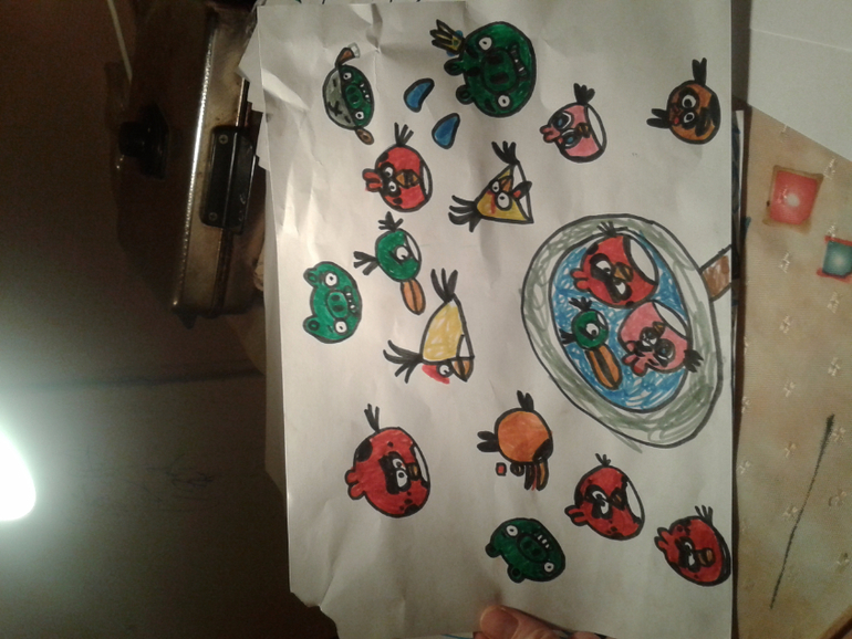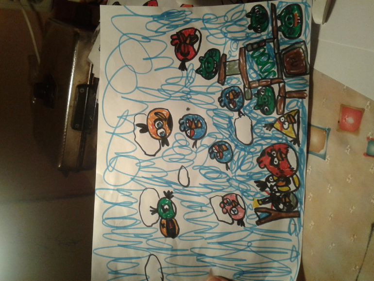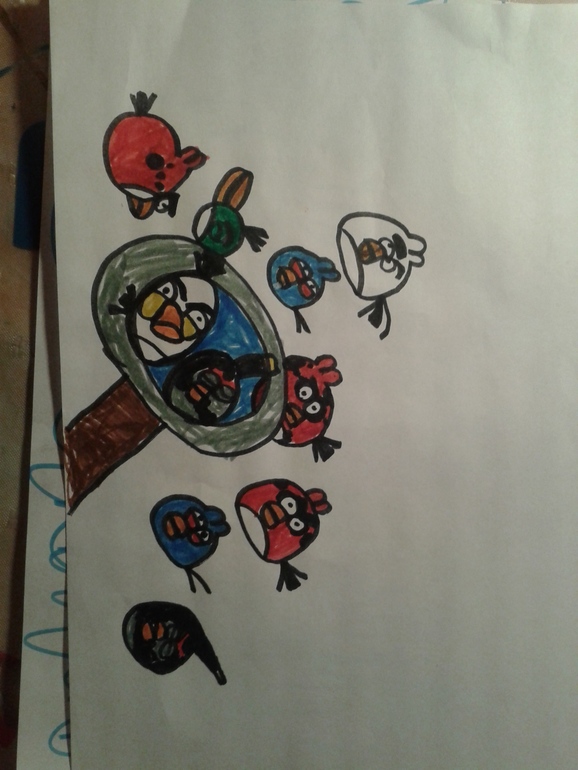 Когда и это дошло до абсурда (шел по городу, а сам по кустам грибы высматривал), наступила зима и страсть поутихла. Но надо же чем то заменить. И вот пришли эти птички!!! Я уже запретила в них играть, тогда он начал их неистово рисовать!