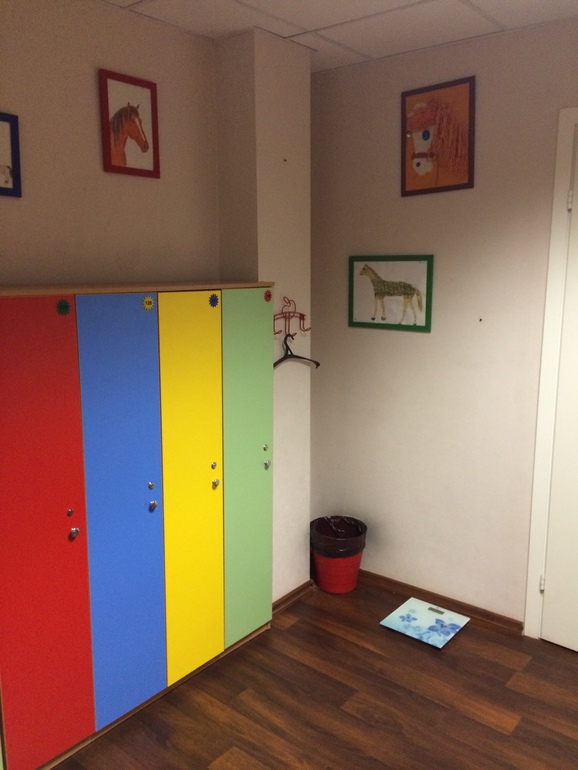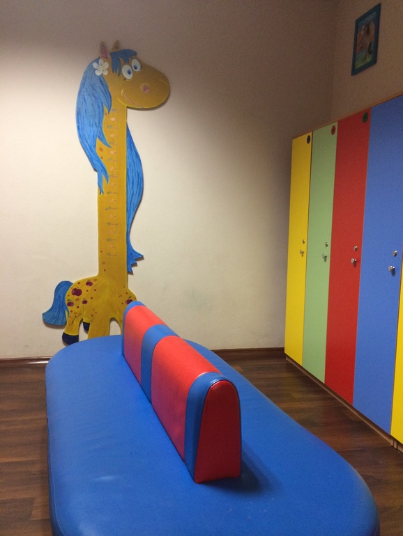 За дверкой душ и умывальник. Вся раздевалка украшена детскими рисунками. Жаль, что нет туалета. Приходится водить дочку по коридору в женский. Не очень далеко, но не удобно.