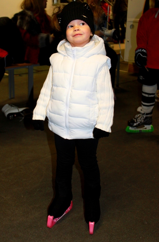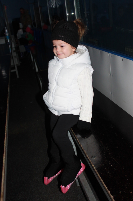 Для первого раза на профессиональных,остро заточенных коньках получилось очень хорошо!!! Сначала за ручки,потом я страховала сзади,потом сбоку, а потом и вовсе еле успевала догонять!