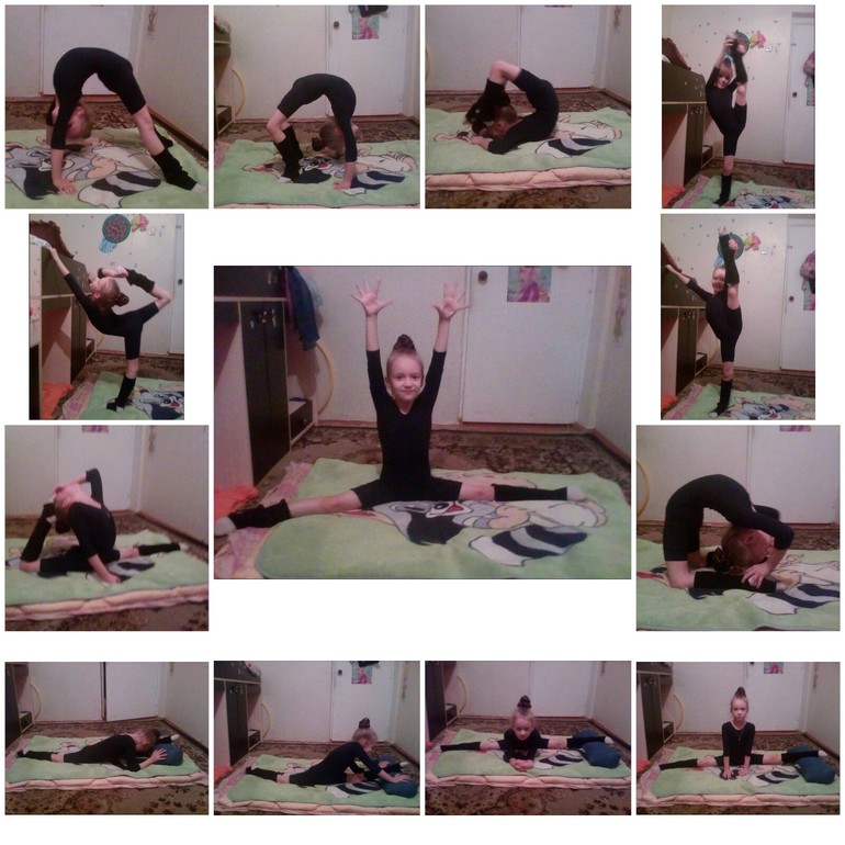 Этот вид спорта покорил сердце моей доченьки!!!!Она очень старается,дома тоже по несколько раз в день разминается!В этом фото достижения Дашеньки всего за 1,5 месяца тренировок!Нет конечно так как она пришла в гимнастику после танцев,какая то подготовка у нее была,поперечный шпагат она делала,гибкая была,но многих вещей не умела)))