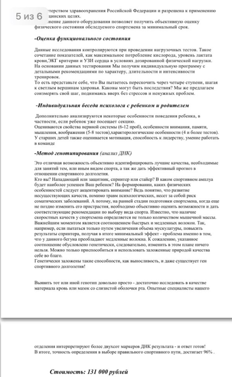 Вообще-то такая услуга есть бесплатная,на государственном портале есть запись на подобную процедуру!то,что предлагается тут очень дорого и не дает в итоге гарантии,что ребенок будет успешен в виде спорта,который будет предложен по результатам тестирования,т.к 90%…успеха в спорте-это желание и труд,а не физические природные данные!!
