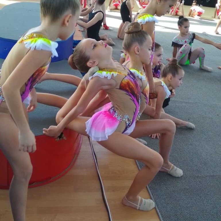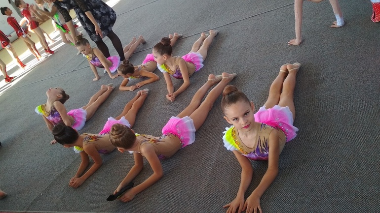 Напомню, что в эту команду нас взяли полгода назад. Команда была слабая, так как не повезло с тренером. Девочки сильно отстали в физическом плане от сверстниц, но смена тренера дала свои плоды. Собственно, наша тренер и взяла эту команду, а дочь в ней была в запасных. Долго догоняли, но в итоге что-то наверстали. У девочек была плохая растяжка (да и сейчас у некоторых она хромает)... у моей же Ольки гибкости было не занимать, но мышечный корсет оставлял желать лучшего.