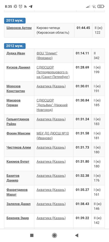 Плавание (Бассейн)2 дня были на соревах в другом городе, плыл 100 в первый день и 50 во второй, все вольным стилем. Задача была взять 2 юношеский. В первый день выдохся на середине дистанции, сразу выложился на первом бассейне и в конце не осталось сил на рывок. Расстроился 1 секунды не хватило до разряда. Время улучшил, тренер проговорила с ним ошибки, настроила на второй день. Разозлился, весь вечер прыжок отрабатывал (есть проблема старта, плохо отталкивается) проплыл хорошо на 2 день 50 м с результатом 0.42.53 (было 0.45.88) доволен и старт относительно неплохой был. Но так как детей соединяют 2011-2012 годы рождения оценивают вместе, то общее 5 место. Тут поник, расстроился, пока стояли и ждали старта познакомился с ребятами сказал им уже по 10 лет всем, одному 9, а мне только 8 почему я с ними соревнуюсь? В его детской голове это не укладывается. Подвела к спискам показала что из 22 человек 5 место это неплохо, к тому же 2012 года всего четверо было и они все за тобой, если б разделили по годам среди 12 года ты был бы первый........вроде все понял, но медали то нет((( Подруга его "боевая",с которой они везде на соревах ездят взяла 3 место, за нее порадовался.