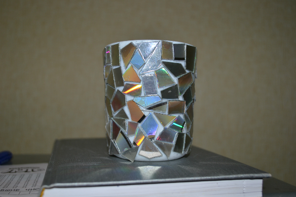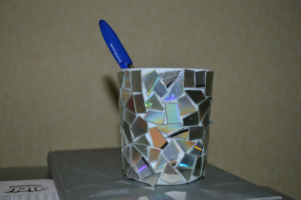 сегодня украшали стакан для зубных щёток.))нарезали кусочков из ненужных компакт-дисков и на момент посадили.получилось немного корявенько,но зато дочь сама приклеивала.)