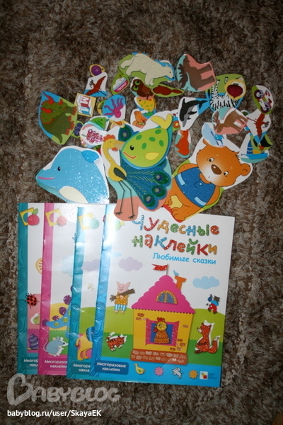 ТворчествоПро серию книжек писали не один раз. Нам они тоже очень нравятся. Все уже поклеено, некоторые куплены даже по второму разу. Естественно многоразовость наклеек весьма условна. Т.е. переклеить их сразу можно. Но, через какое то время отрываются они вместе с бумагой. А те, что все же соглашаются отдаться обратно, на новом месте не держатся. Так вот. У книжек очень хорошая обложка. Она довольно плотная, рисунки на ней отдельными фрагментами, а некоторые еще и с блестками. А значит из них легко изготовить наклейки.