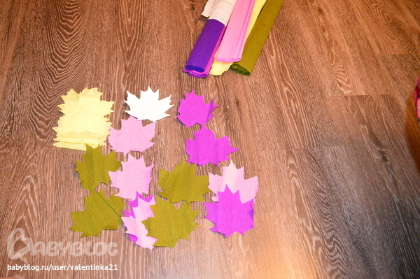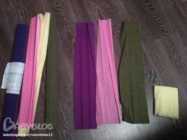 Креп бумага купленная на любимом ред.ру, нарезанная полосами, и сложенная под размер листочка.