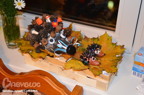Маленьких ежиков делал сам! У большого - красил морду, приклеивал шишки и сам лепил грибы из пластелина(у нас было мало шишек)