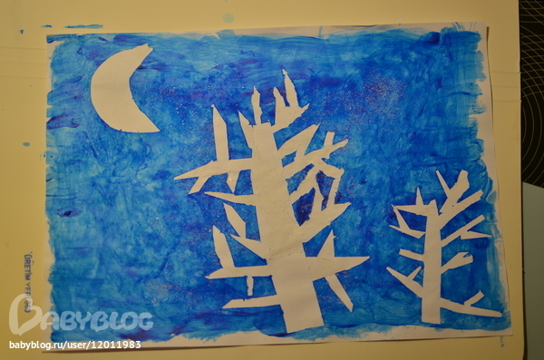 ночной лес! Мне понравилось, но скотц ТАК сильно прилип к бумаге, что еле оторвали его - с бумагой рвали. Я б посоветовала изоленту клеить. И с солью у нас не получилось.