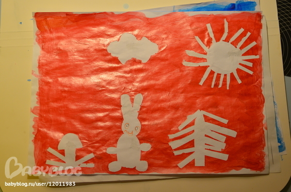 В процессе вырезания и приклеивания фигур - Мишка решил сделать ВЕЧЕР, ЗАКАТ, поэтому появилась такая краска.
