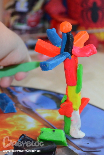 ТворчествоКупили мы яркий пластилин и бегом домой,я на кухню обед готовить,малой за епку уселся,моя роль все подготовить- рабочее место))) А тут уже что слепишь то ибудет,никаких заданий))) Я себе готовлю,в комнате тишина,процесс творческий кипит, и тут сына с гордостью зовет меня посмотреть свой шедевр: