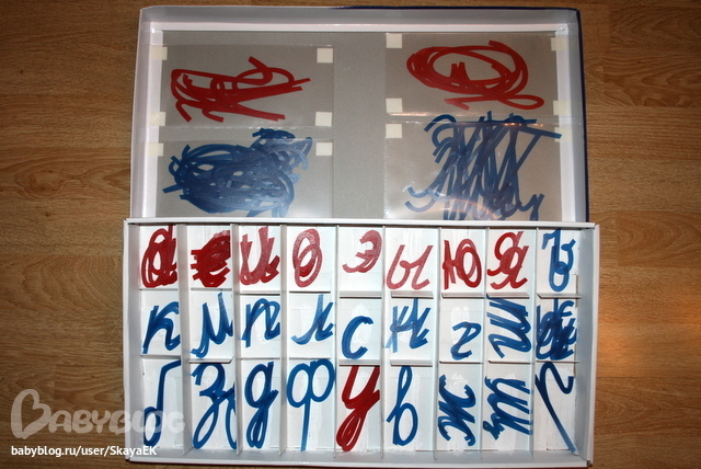 В коробке сделала ячейки, наклеив их из картона. Заглавные буквы "живут" довольно большими кучами на крышке этой коробки в пластиковых кармашках (не очень удобно, но пока ничего лучшего я не придумала). Кстати, о количестве букв. Первоначально я собиралась резать по 3 каждой. Но, хочу сказать, что можно обойтись и меньшим количеством.