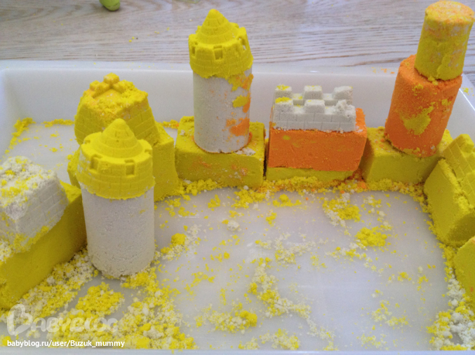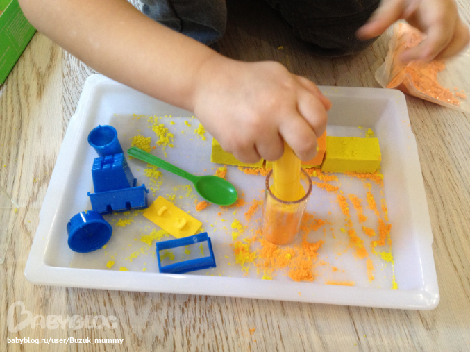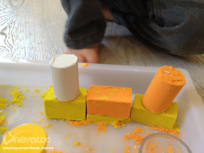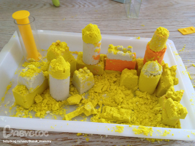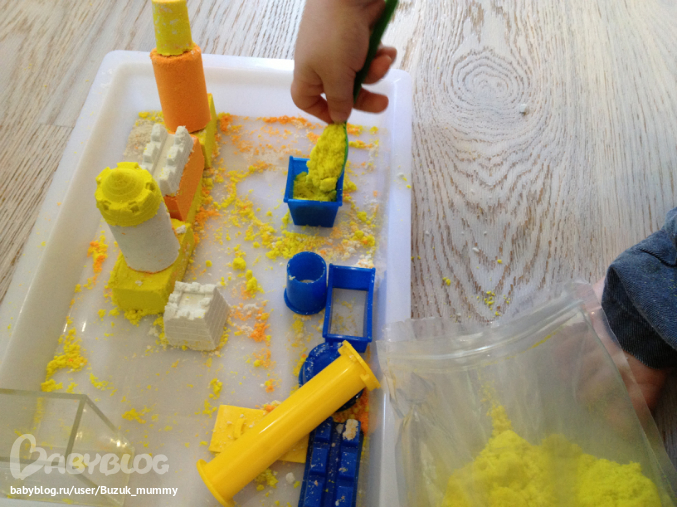 Занятия с песком в домашних условиях это реально - причем у нас оказалась даже не очень страшная в плане песка по всему полу. Занимались очень увлеченно и долго, делали кирпичики и столбики с помощью пресса и украшения замка с помощью формочек.