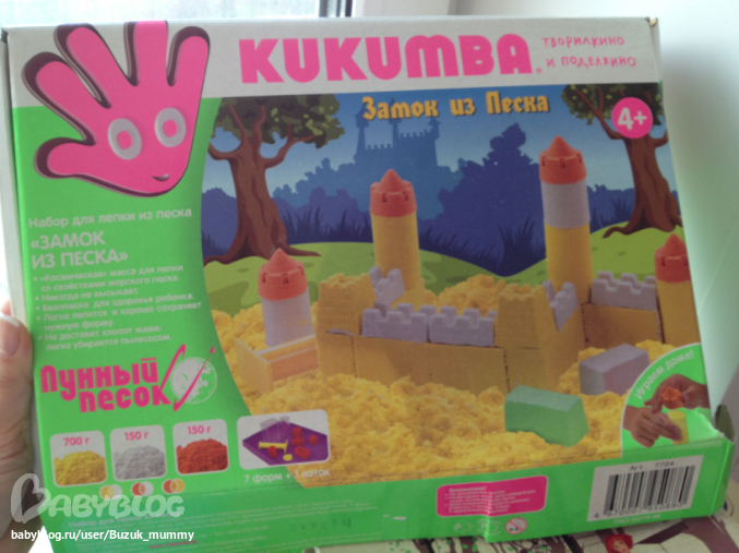 в нем три цвета песка, две формы для пресса, и немножко формочек, песок на ощупь приятный, мелкий и немного влажный, при насыпании в формочку пальцем утрамбовываем и он достаточно сильно продавливается. полученные песочные кубики-кирпичики можно аккуратно руками перекладывать.