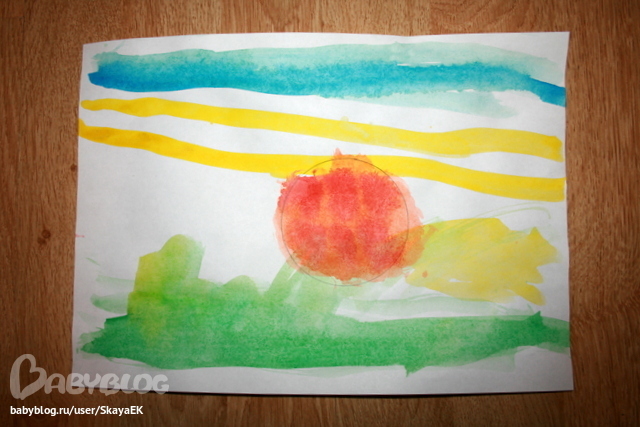 Конечно, "волшебный ящик" без внимания не остается. Оказывается днем идет немало интересных программ. Одна из наших любимых "Давайте рисовать" по Карусели (надо будет поискать и скачать все выпуски). Сегодня рисовали мячик на полянке. Сашин вариант