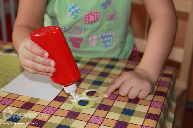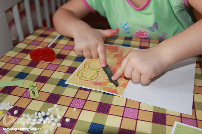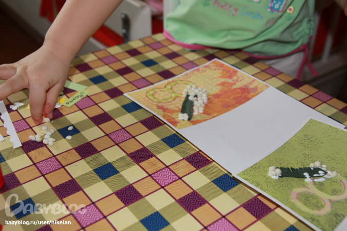 Настя говорит - "Я тут клеила пшено, ну которые еще птички кушают, вот так... - пальчиком..."