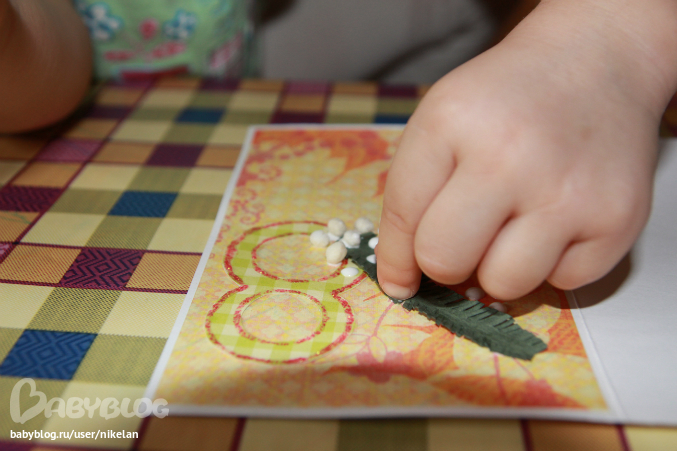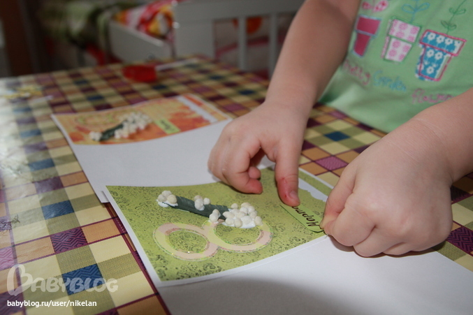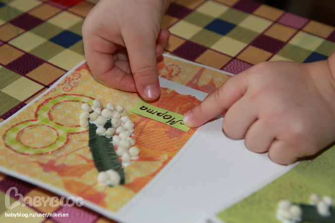Далее процесс, как маленькие ручки клеят детальки открытки, шарики мимозы...