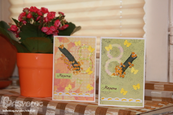 Вот такие открытки Настя подарила воспитателям утром 7 марта, когда пришла в садик. Только она не стала говорить, что принимала активное участие в этом))))))