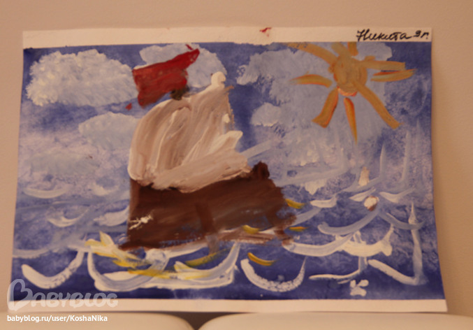 Девочки, у них было 3 КИСТИ !!! и они рисовали ... пейзаж, я в шоке !!! Я думала, будут там каля-маля, разлитые краски, ну все в духе малышей... А тут на тебе - все абсолютно по-взрослому, она требует от них правильных движений, и объясняет как кистью "гладить" лист и еще столько всего не перечесть. А главное рассказывает полностью про то, что они будут рисовать - из чего предмет состоит, для чего нужен и про солнечные зайчики, которые в воде отражаются. Девочки, мои эмоции возможно слишком яркие, просто мы еще никогад в творчество не окунались и для меня это новое и совершенно не знакомое ощущение.