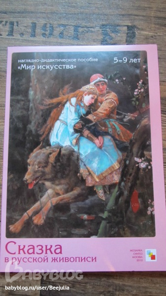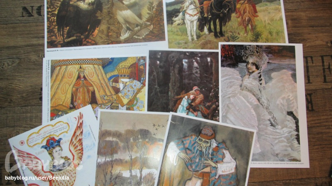 Я очень люблю карточки, особенно с произведениями искусства. Я периодически вешаю разные картинки на стену и мы их рассматриваем в течение дня. А эти картинки еще и по сказкам.