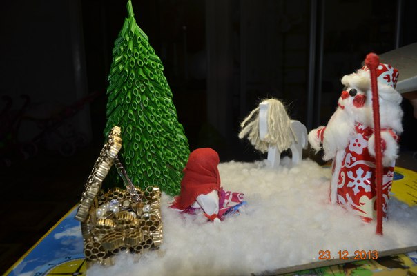 Идея новогодней подделки родилась неожиданно!Хотели сначала сделать просто елочку из необычного материала-макарон)).Мне показалось что это скучно. А вечерком прочитала девчонкам своим сказку "Морозко" и понеслось))).Спасибо нашему папе он нас в наши идеи всегда поддерживает.