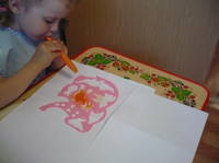 Это то, про что я писала выше - здесь довольно сложные, извилистые линии хвоста и шеи с головой, так что надо ребёнку чуть-чуть помочь и придержать трафарет.