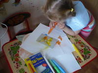 Пока писала отзыв, дочка уже распотрошила книжку и стала сама делать поделку. Первым схватила жирафа (уж очень красочный, рыжий :) ), и решила его украсить - стала рисовать на нём пятнышки. Пришлось объяснить, что трафарет надо всё-таки сначала обвести, аккуратно его прижимая, а уже потом раскрашивать :)