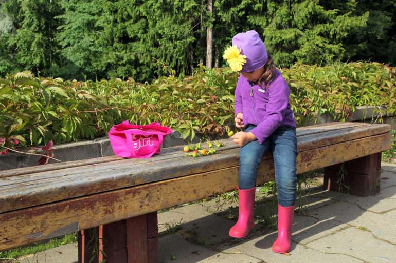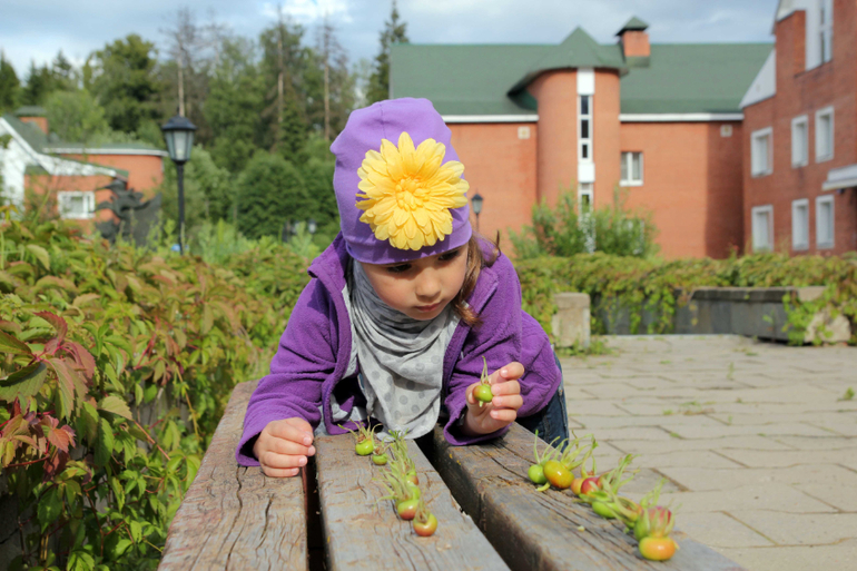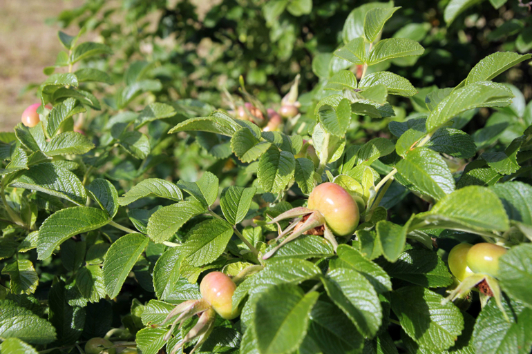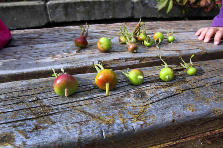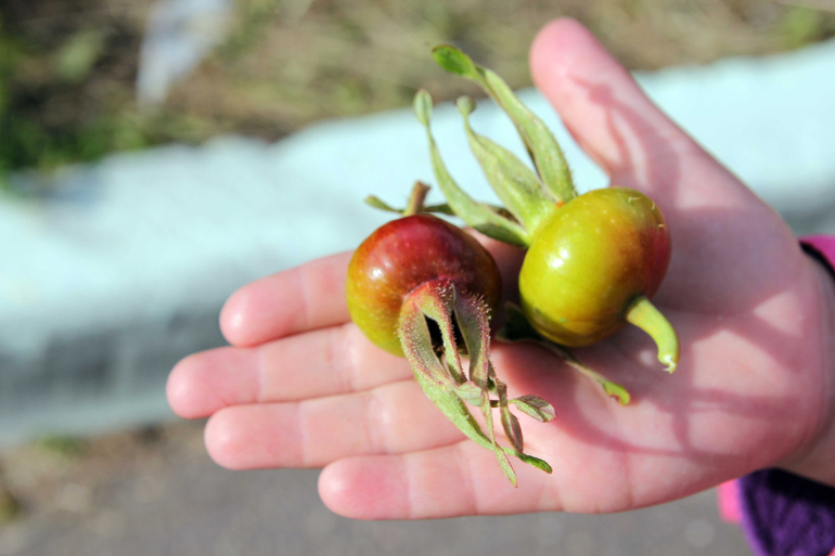 Подошли снова к кусту шиповника, решили нарвать несколько штук для игр...